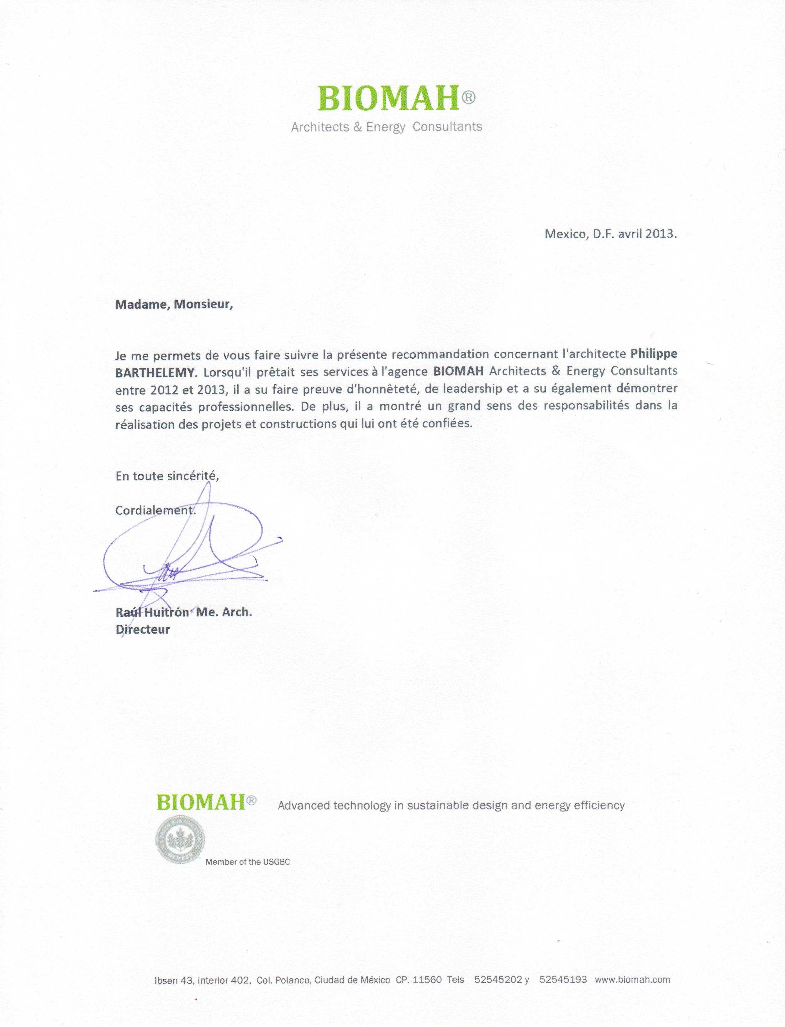 Lettre de recommandation de Biomah Architects